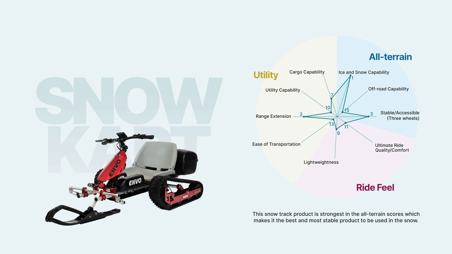 The V shape knob rubber track creates great traction with almost any type of snow terrain, proven up to a 20% slope. It has a well-thought geometry, secure in track with minimized resistance and energy loss which can generate up to 100KGF (220lbs) of traction. Made from rubber and Kevlar reinforcement, It is relatively light, safe and easy to handle when it comes to adjustment or replacement.
